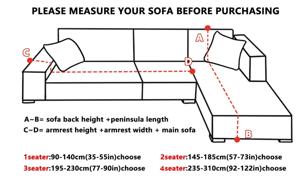 - Przed zakupem należy dokładnie zmierzyć rozmiar pokrowca na sofę. Odpowiedni rozmiar 1-osobowy: 90-140 cm; 2-osobowy: 145-185 cm; 3-osobowa: 195-230 cm; 4-osobowa: 235-310 cm.