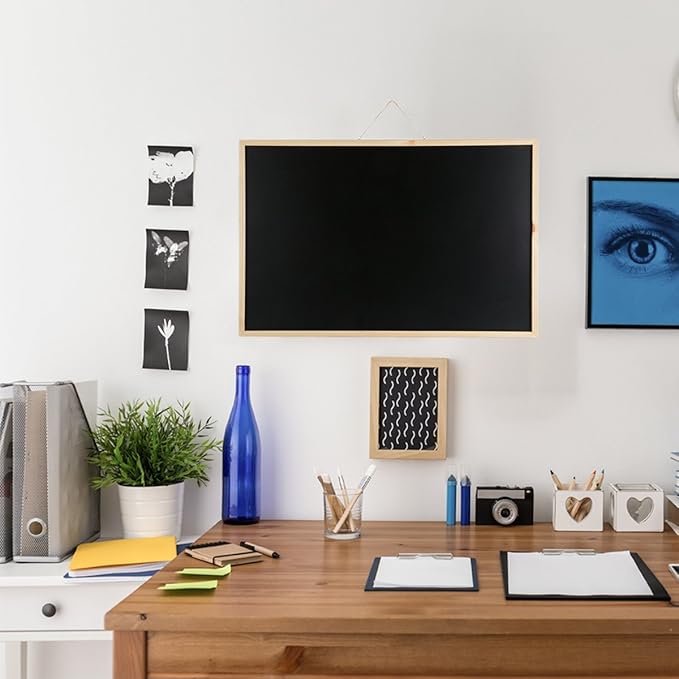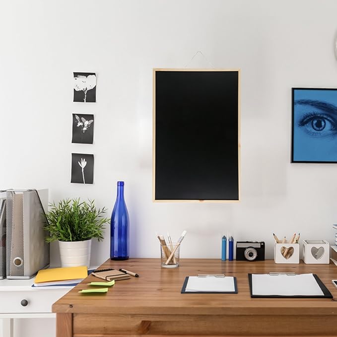 - Czarna powierzchnia zapewnia doskonały kontrast w połączeniu z białą lub kolorową kredą. Można ją zawiesić poziomo lub pionowo, w zależności od potrzeb, jest lekka i poręczna.