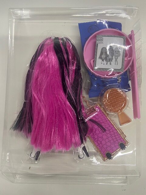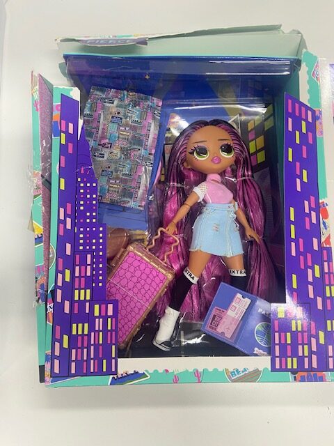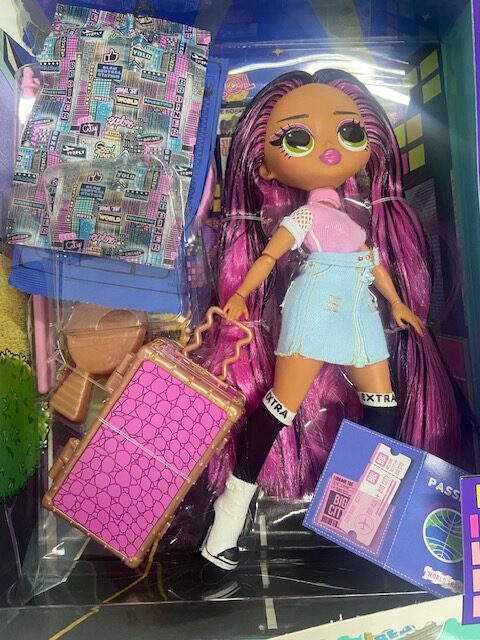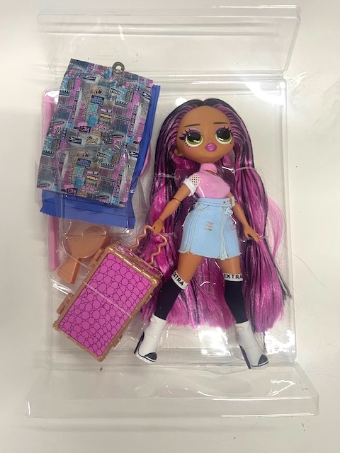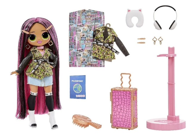 DUŻO ZABAWY – zestaw zawiera lalkę modową LOL Surprise OMG, strój, akcesoria, kolczyki, buty, walizkę, słuchawki, poduszkę na szyję, spinkę do włosów, paszport, szczotkę do włosów, torbę na ubrania, wieszaki, stojak dla lalki.
