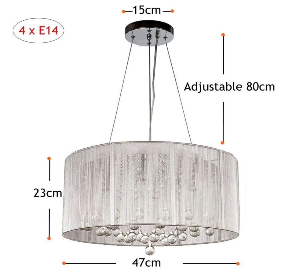 • Abażur materiałowy: 47 x 47 x 23 cm, podstawa sufitowa: 15 cm, regulacja wysokości: do 80 cm, oświetlana powierzchnia: 15-20 ㎡,