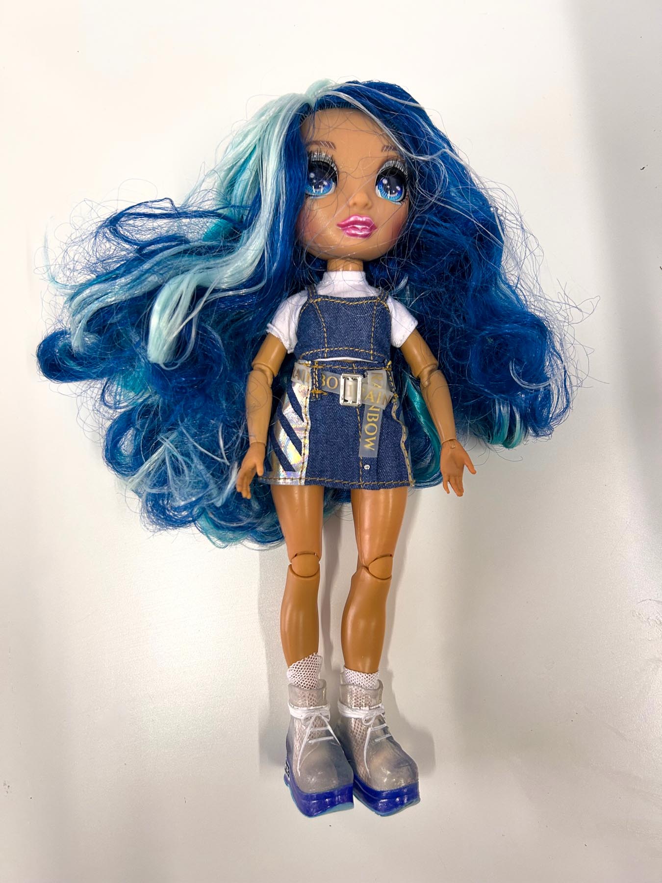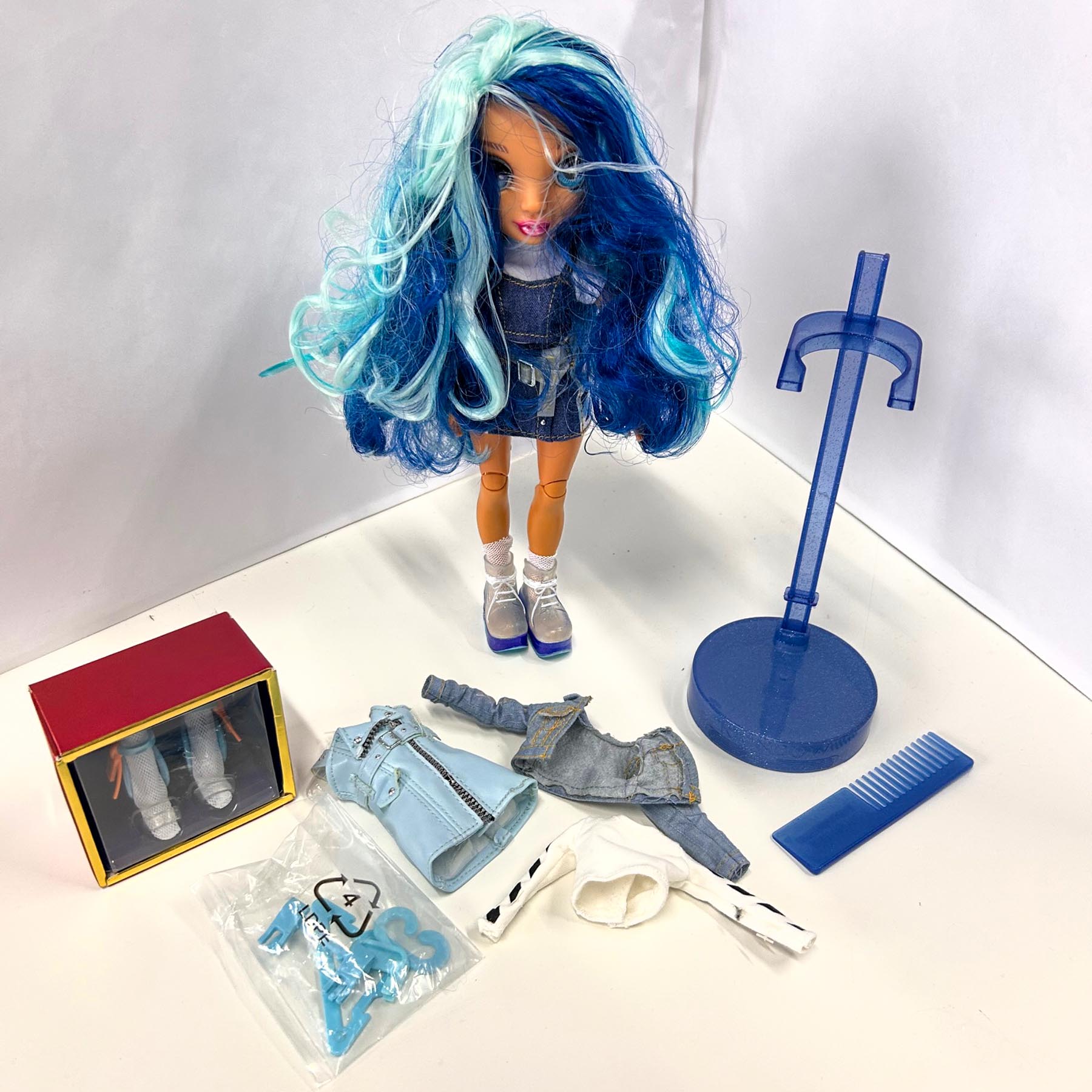 Skyler Bradshaw to stylowa lalka fashion z serii Rainbow High, ubrana od stóp do głów w efektowny niebieski strój.