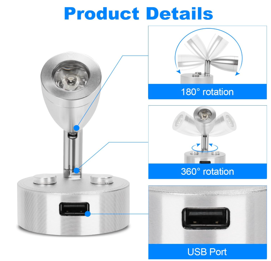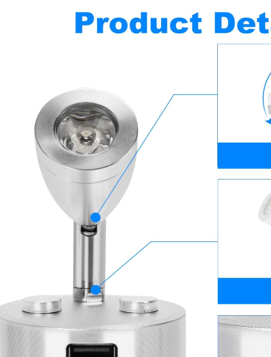 - Regulacja kąta świecenia 180°: Klasyczny design lampek do czytania. Aby uzyskać miękkie oświetlenie bez efektu oślepienia, można regulować kierunek światła, obracając lampkę.