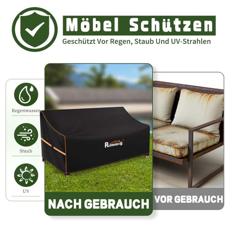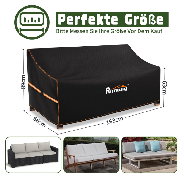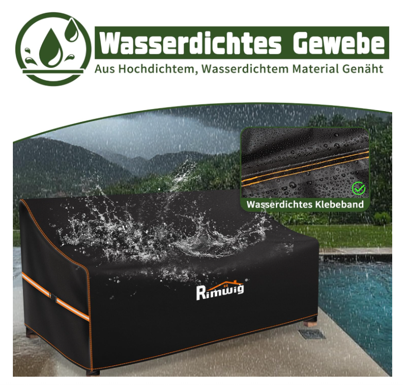 Pokrowiec na sofę ogrodową wyposażony w powłokę nano-PU i wodoodporną taśmę na szwach. Dzięki temu produkt wytrzymuje ciśnienie wody do 15 000 Pa i pozostaje w 100% szczelny nawet po 1500 godzinach stania w wodzie.