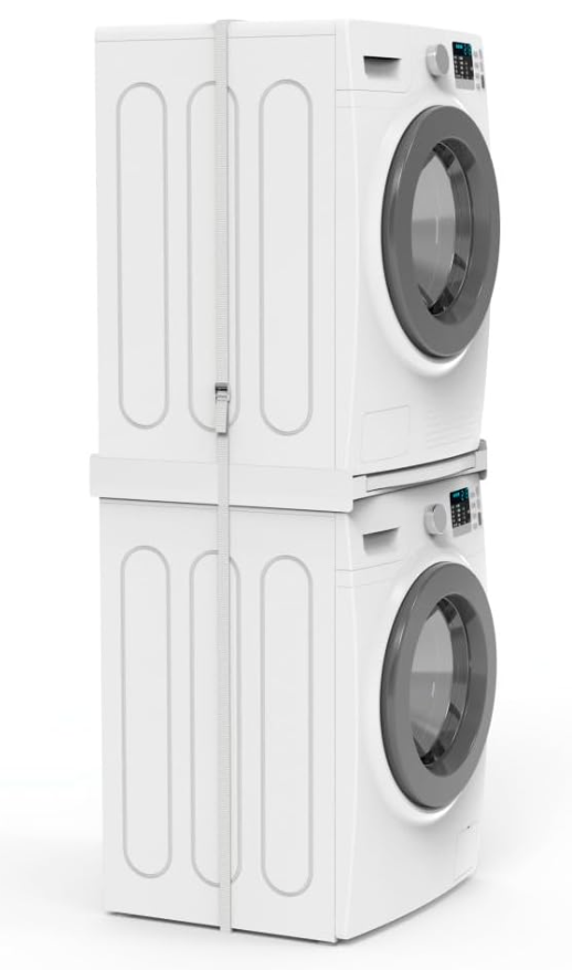 - Oszczędność miejsca dzięki ramie pośredniej: dzięki umieszczeniu suszarki na pralce i bezpiecznemu połączeniu za pomocą paska napinającego